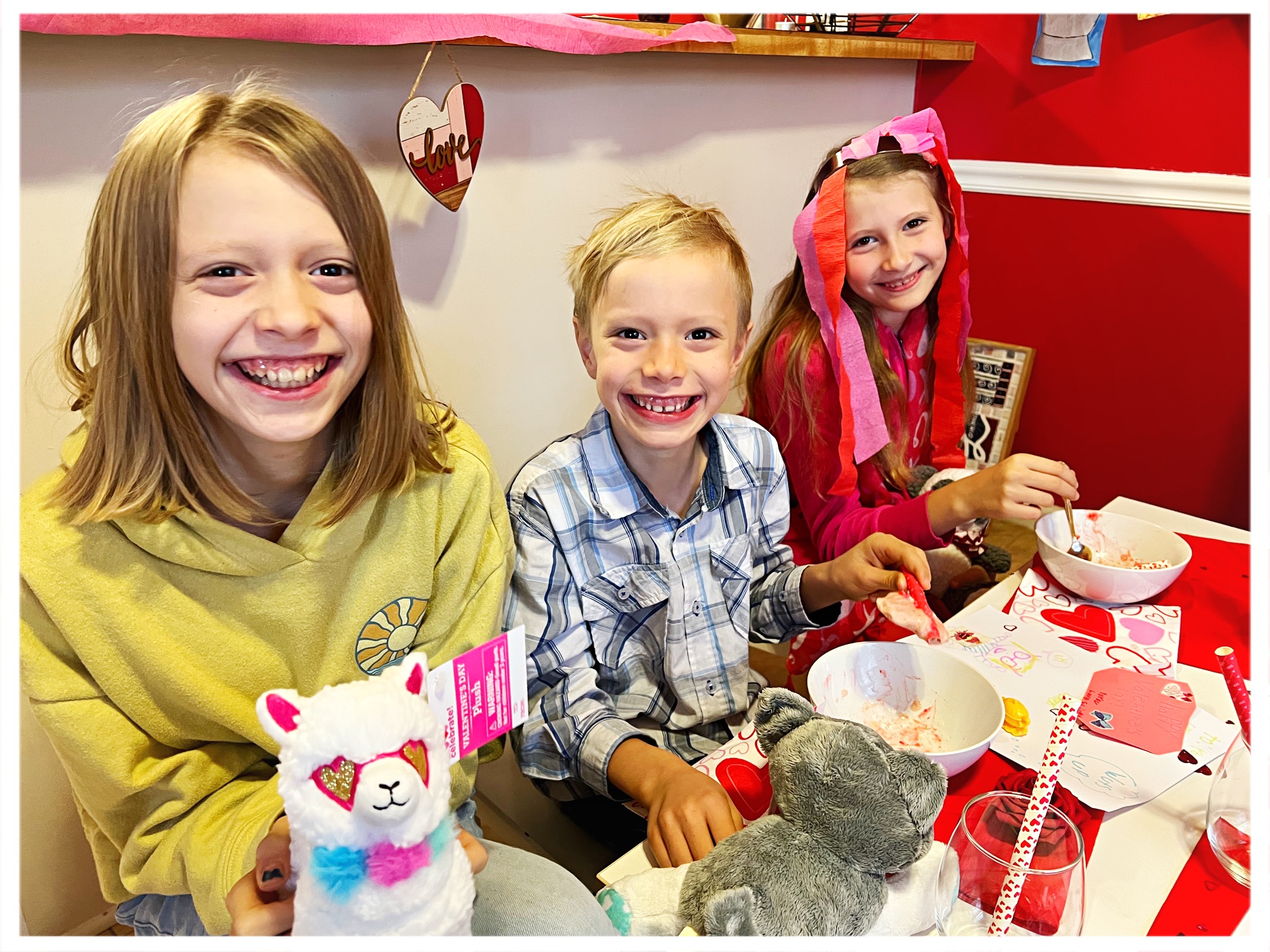 In that we had just got back from out of town, Valentines was low key this year.  However, Shiloh did still decorate a table for her siblings and I got them a little stuffie.